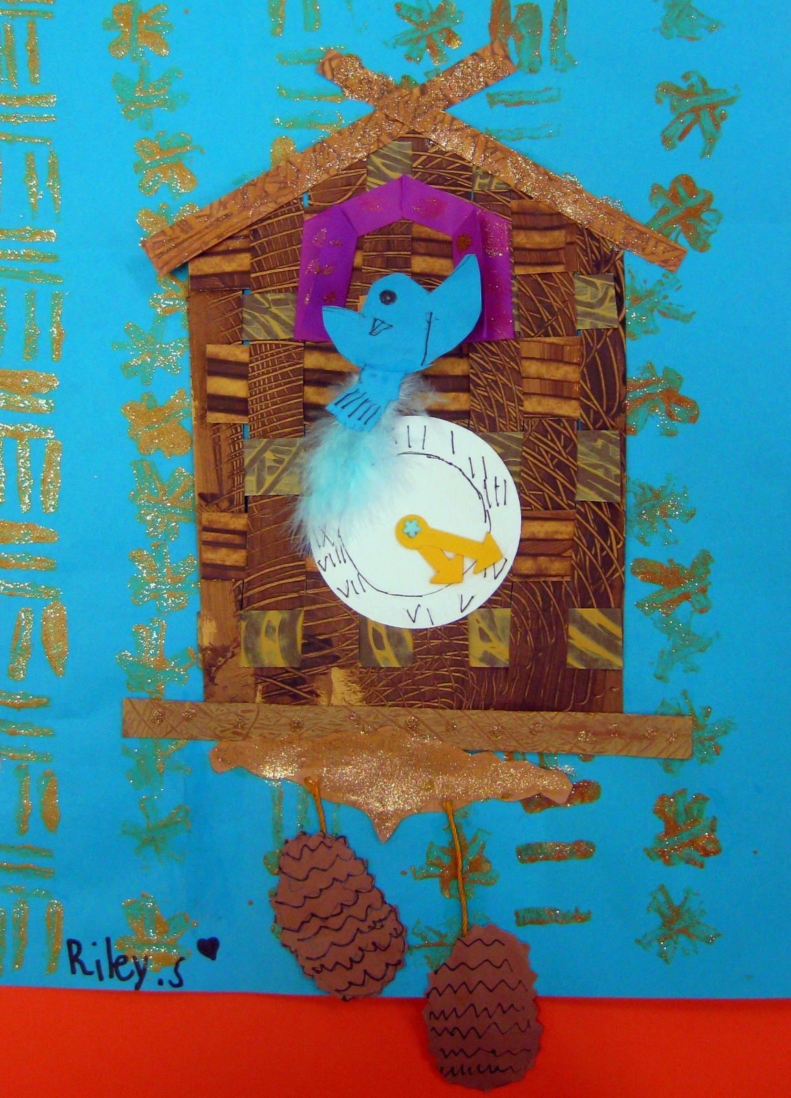 Once all of the pieces were complete, we were ready to assemble our clocks. We began by cutting the top of our weaving so it would resemble a house and glued it to the center of our printed paper. From there, we added our roof, a door for our birds and our clocks. The kids had a lot of fun coming up with what their version of a cuckoo bird would look like. Some added a feather for the tale. All of them zigzag folded a piece of paper that served as their pop out.
