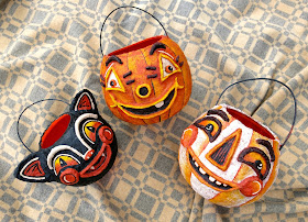 I got the idea from a shop I happened by one morning. They had these sweet little papier mache treat buckets on display in their window that were more than likely made in a land far, far away. I immediately wanted to duck into the shop and scoop them all up but the nearly $40 price tag kept me away. Then I got the idea: I'd just hit up the thrift store on the way home, pick up some plastic trick or treat containers and make my own.